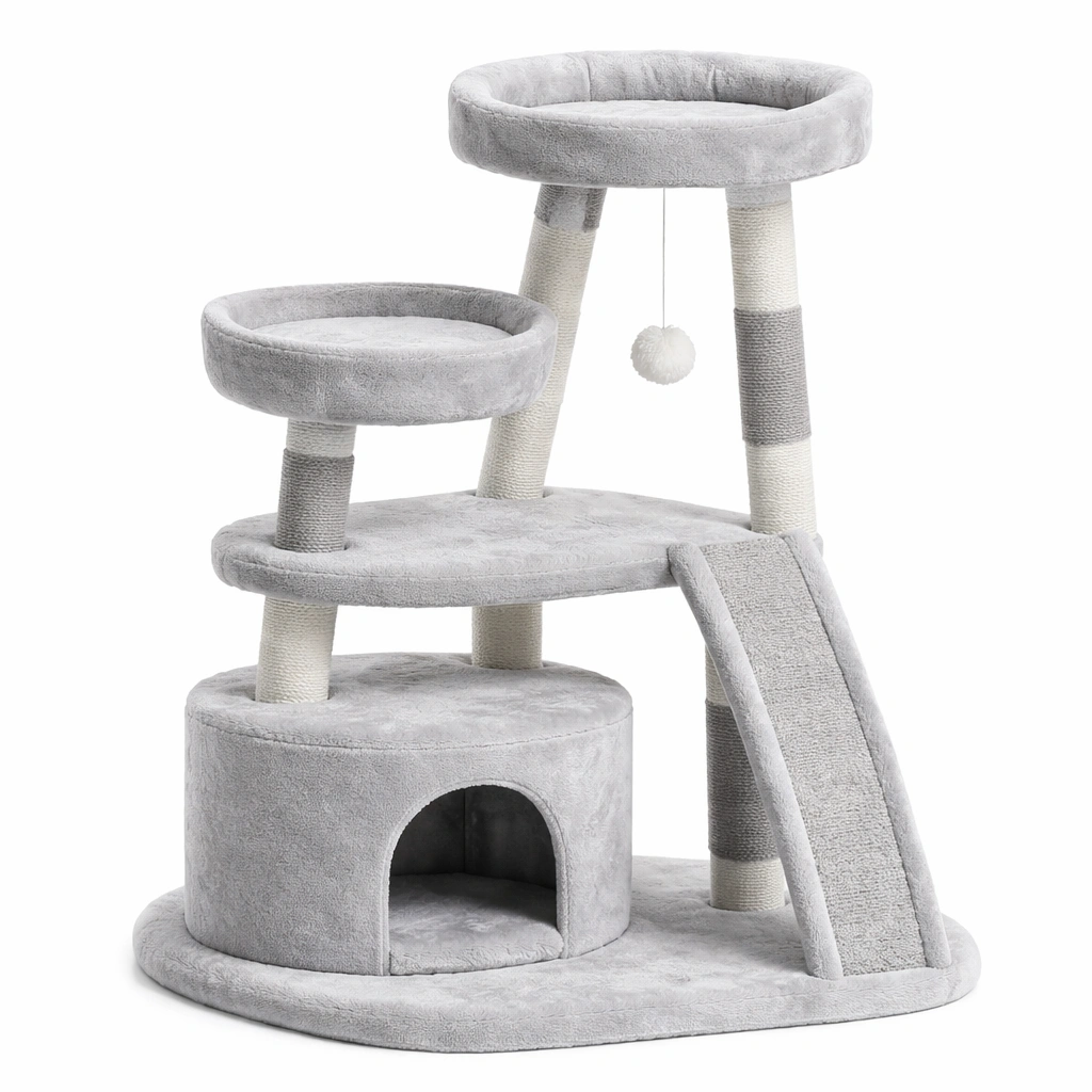 Árbol para gatos de tres niveles con MDF y sisal gris