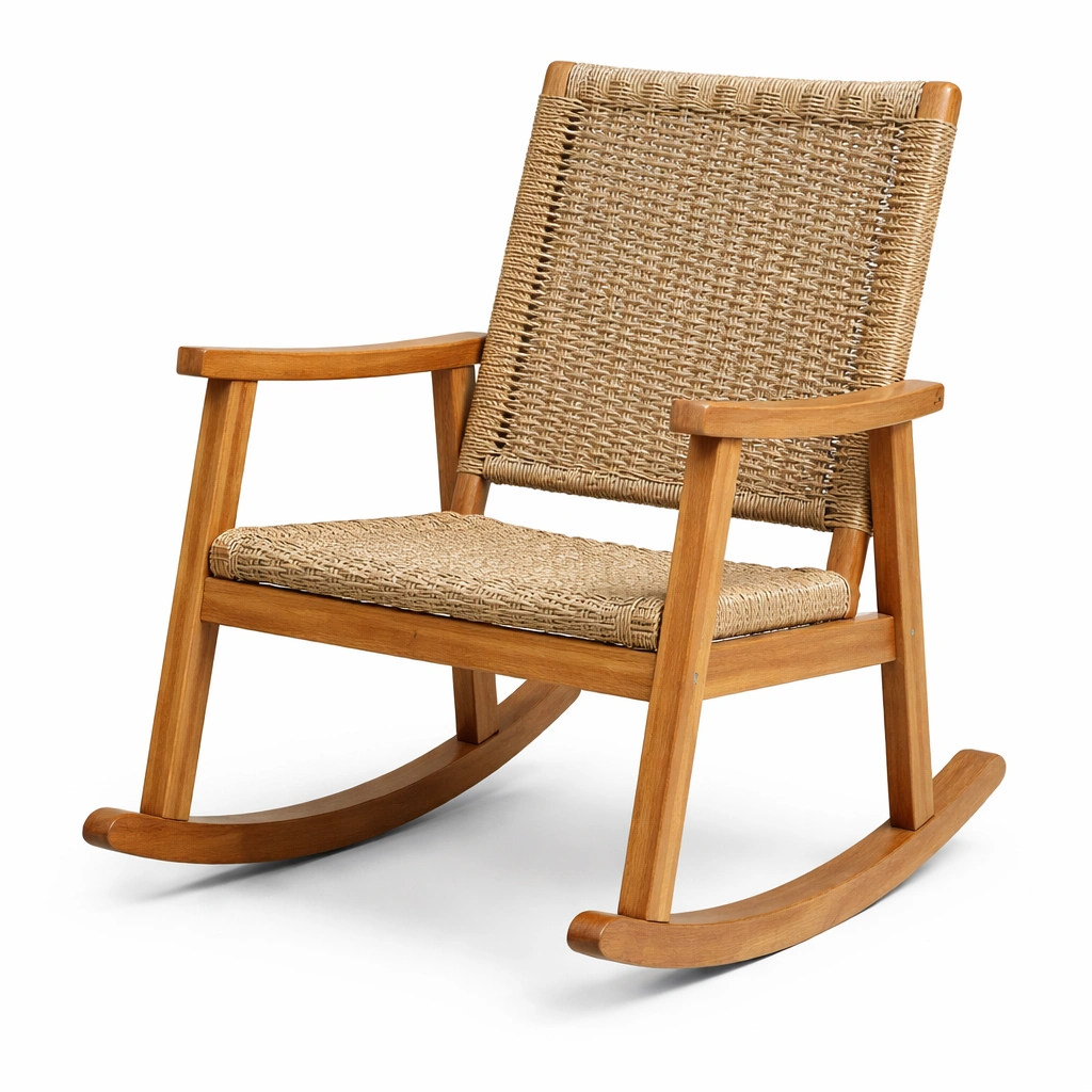 Material: Estructura de madera de teca, respaldo y asiento de ratán tejido