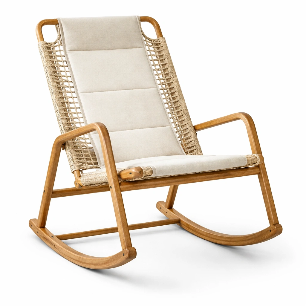 Esta mecedora combina varios materiales de calidad. La estructura principal es de madera de teca, proporcionando una base sólida y duradera. Los laterales están hechos de ratán natural tejido a mano, añadiendo un toque rústico al diseño. El cojín está revestido de lino en color beige, ofreciendo soporte cómodo.